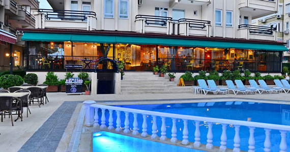 We are at your service during 12 months. Each room has its own air conditioner, fridge, hot water, shower, double balcony, kitchen, telephone, TV and a hair dryer. We are an A'la Carte Restaurant, Pool Bar, Swimming Pool, Child Pool, TV Room, Safe, Sauna, Turkish Bath, Massage and Kinder Garden. We organize Mini Club Animations, Pool Parties and a Special Show once a week.